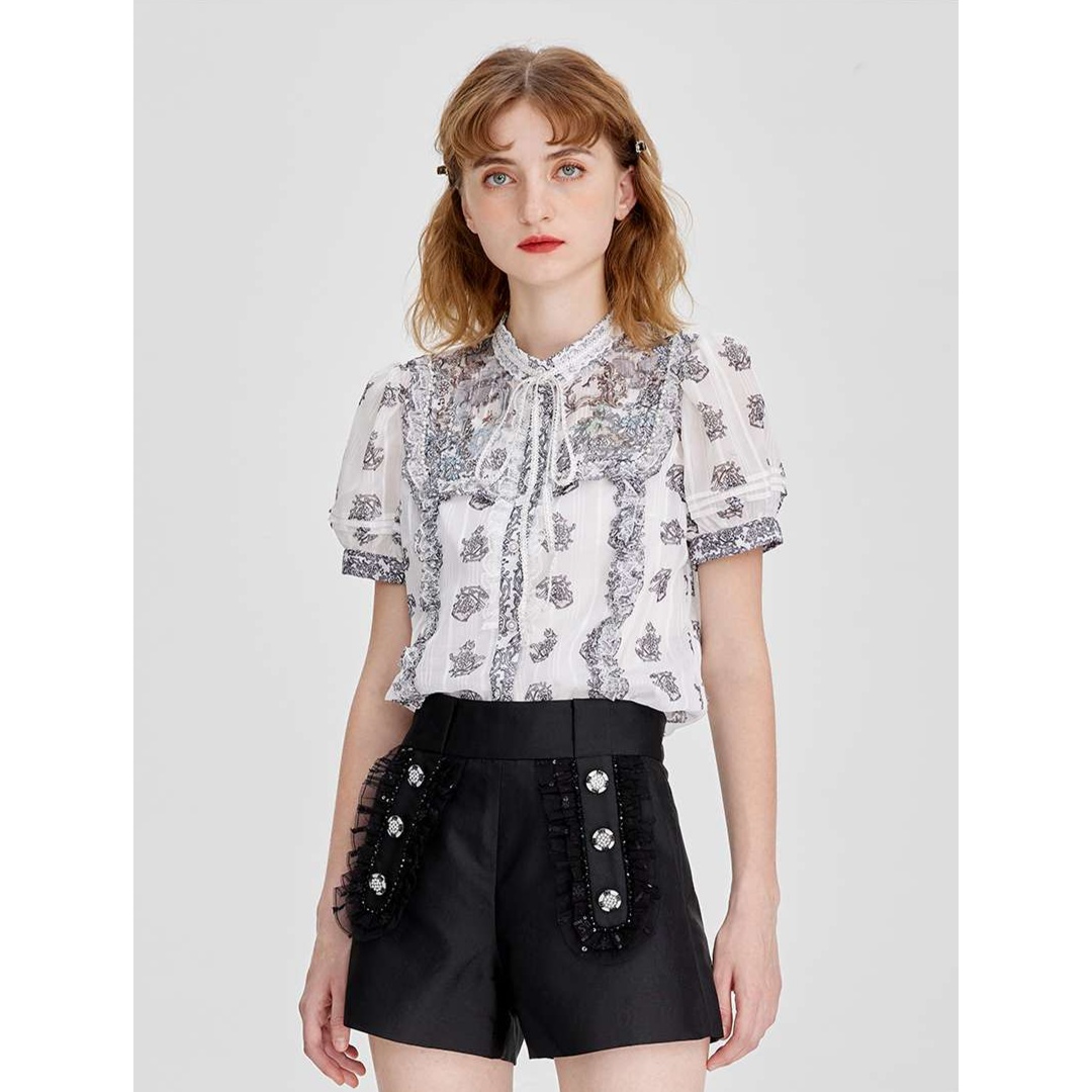 上品な白黒コントラストが映える花柄レディース半袖シャツ
