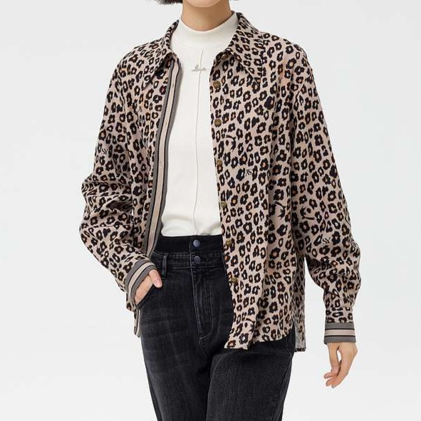 シャツジャケットのような感覚で羽織ることもでき、季節の変わり目に重宝するヒョウ柄ブラウスです。