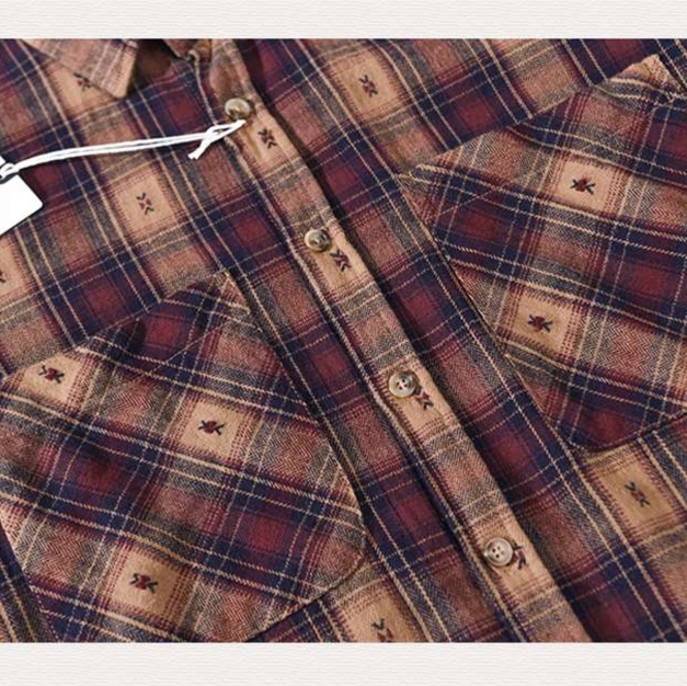 落ち着いたブラウン系のチェック柄に小さな刺繍模様が入り、レトロな雰囲気を演出
