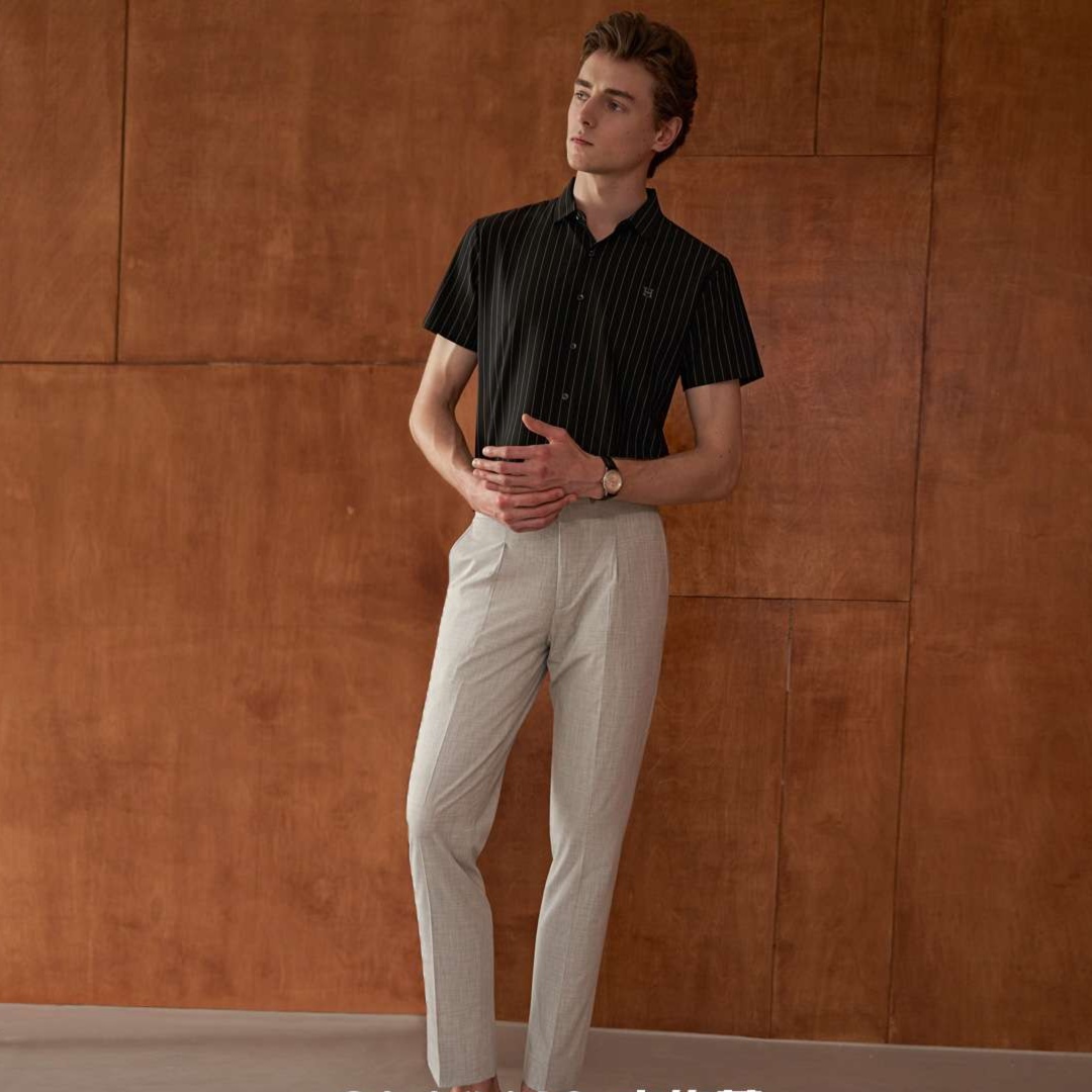 細身のピンストライプが上品な雰囲気を演出し、ビジネスからカジュアルまで対応