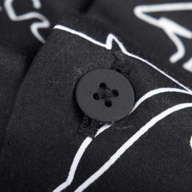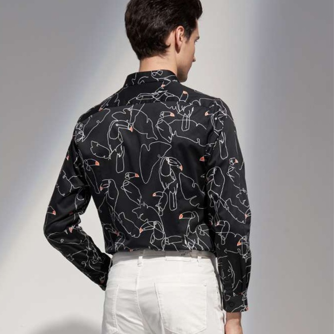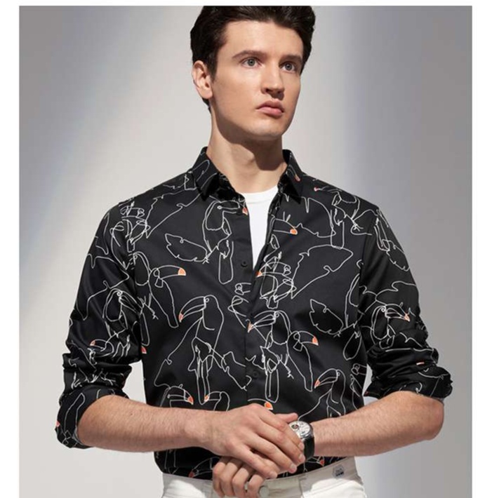 洗練された印象を与える黒柄シャツ。スタイリッシュな線画で描かれた鳥のモチーフが際立ち、シンプルな白パンツとの組み合わせで一層引き立つ。親しみやすさと品格を兼ね備えたデザインで、カジュアルなシーンからちょっとしたお出かけまで幅広く活躍。自信を持って着こなせる一枚です。