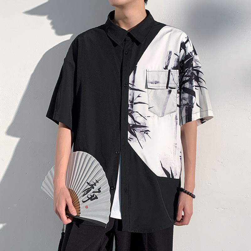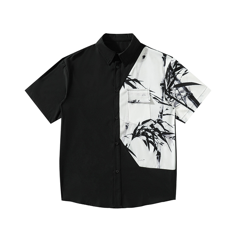 東洋の美意識を感じさせる墨絵風の竹林模様が印象的な柄シャツです。