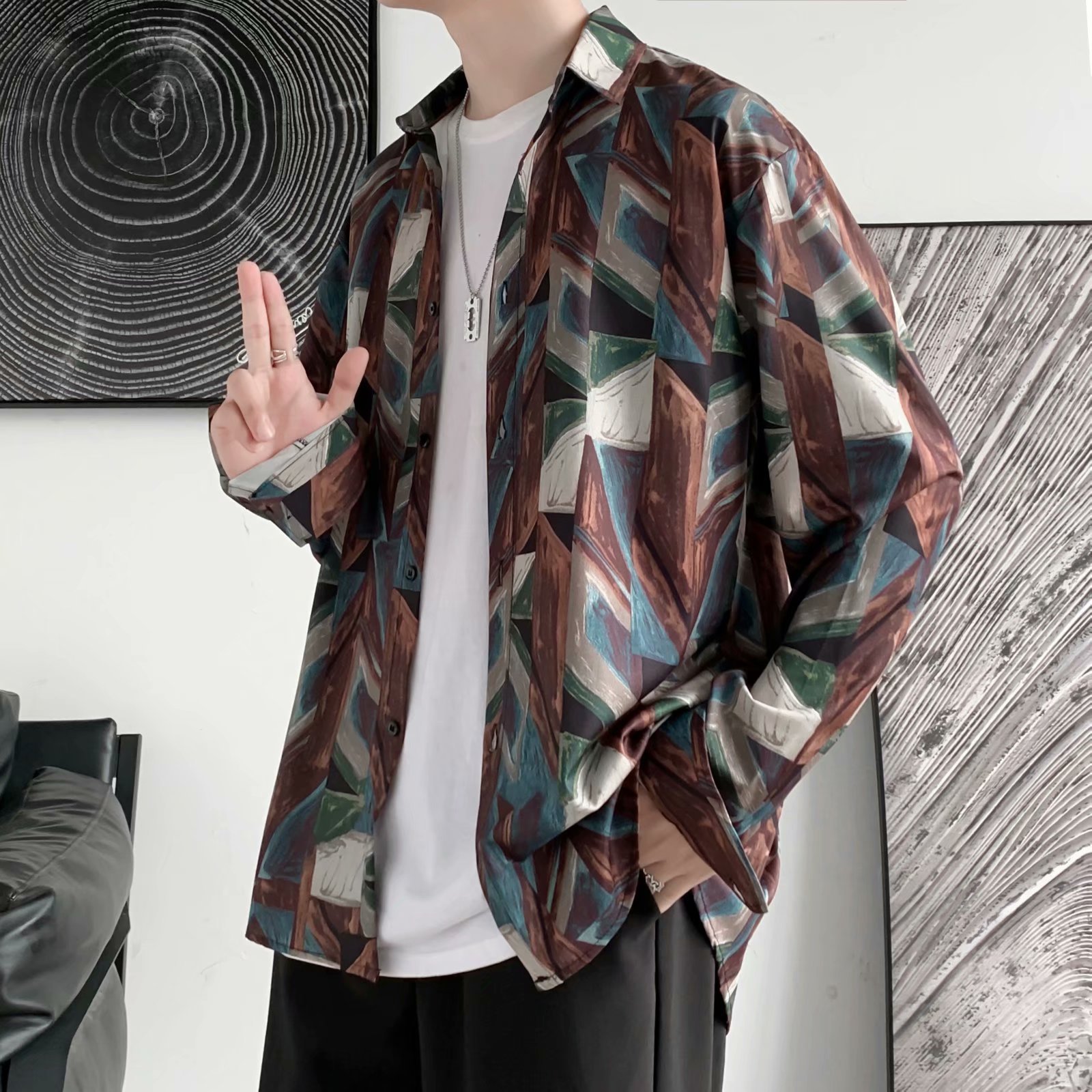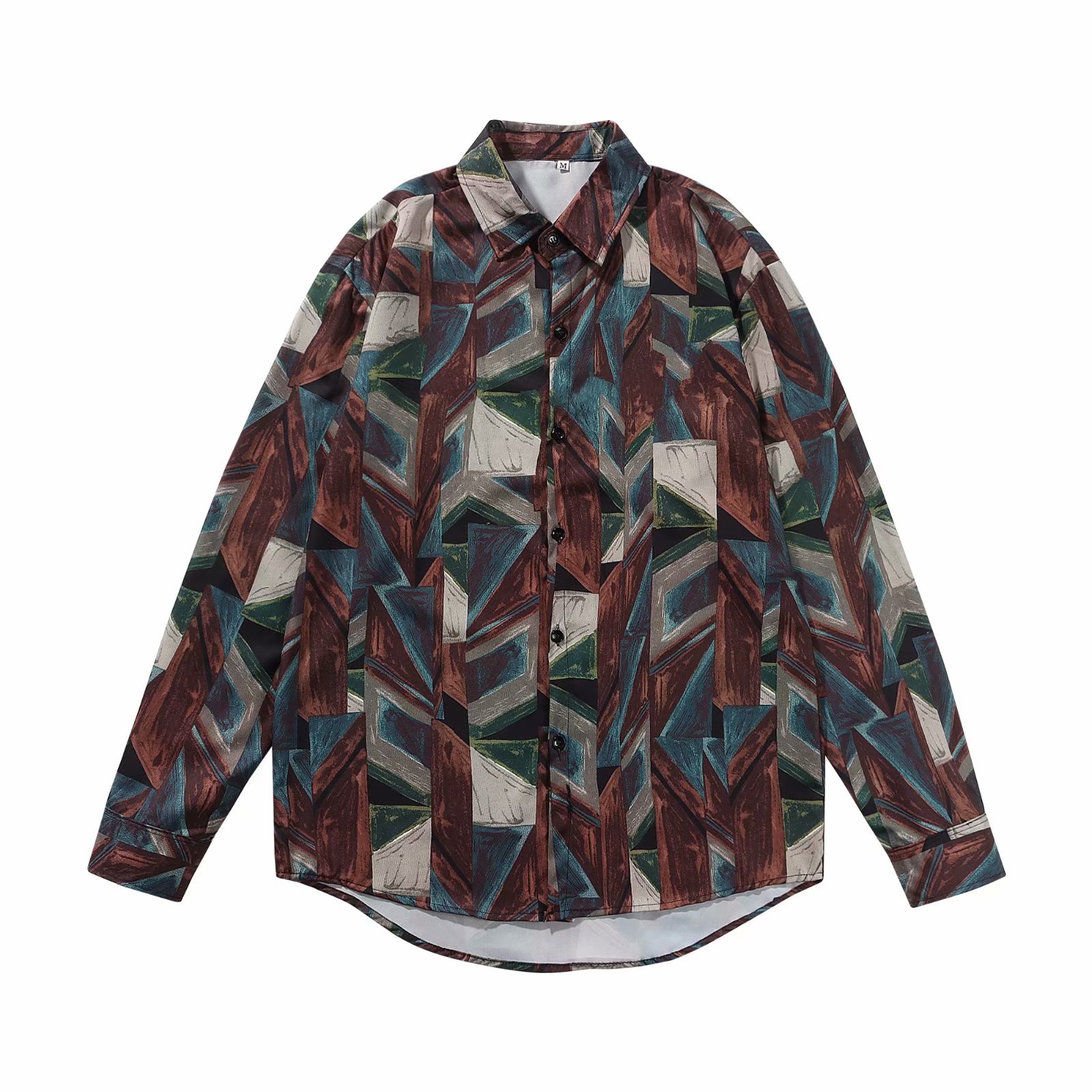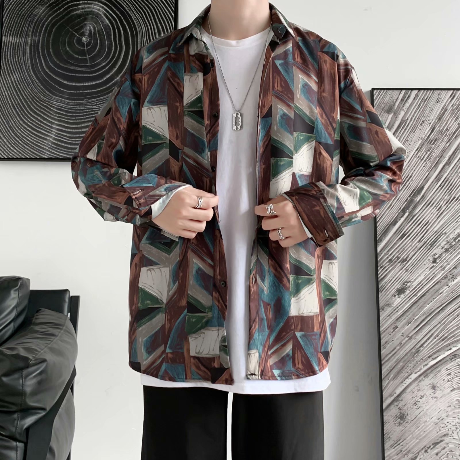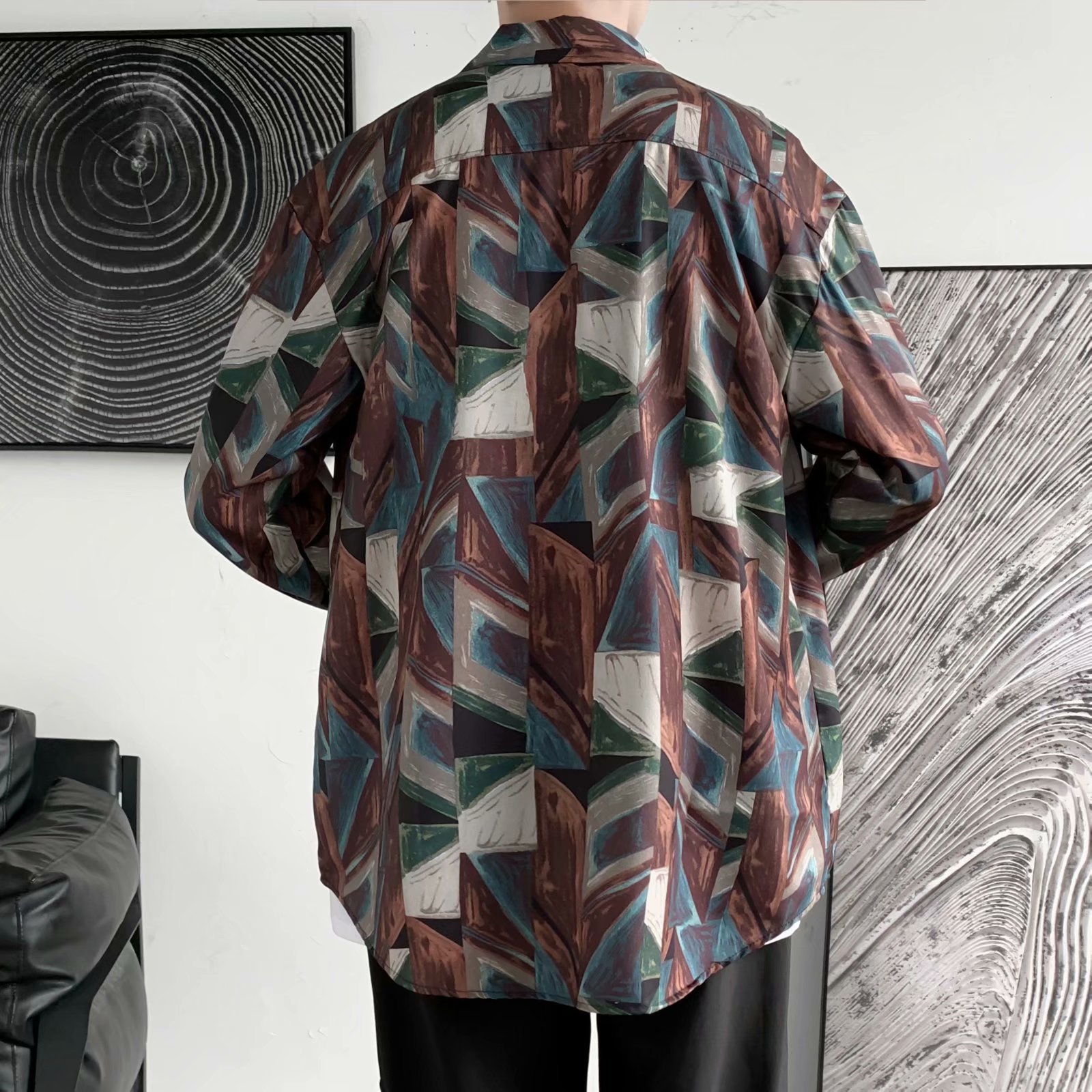 複雑な幾何学模様が全面に施された個性的な総柄シャツです。