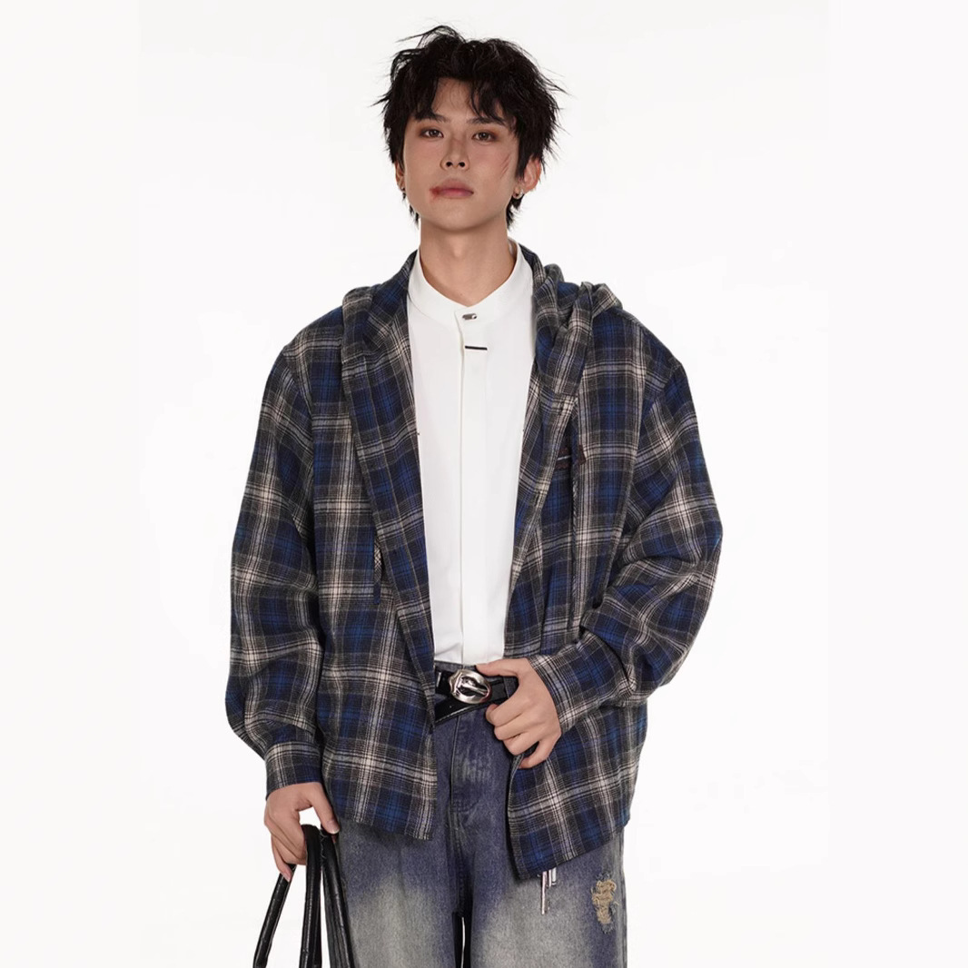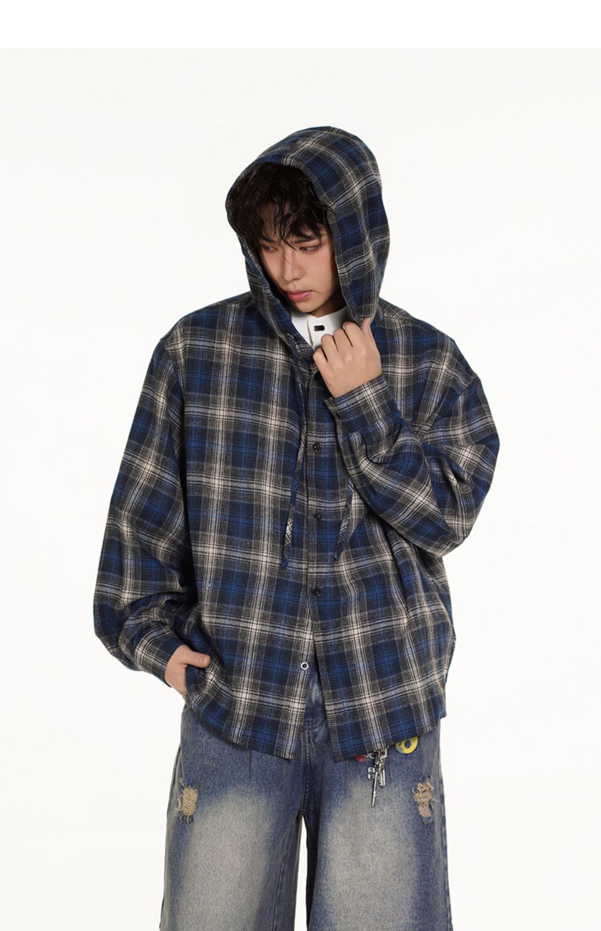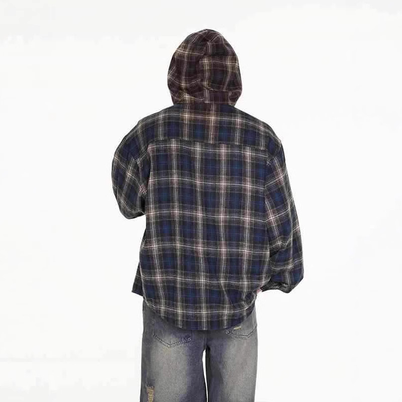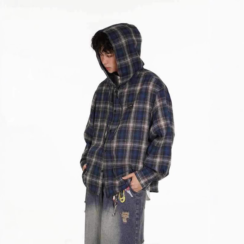フード付きのデザインでジャケット感覚で羽織れる柄シャツとして、幅広いコーディネートに対応します。