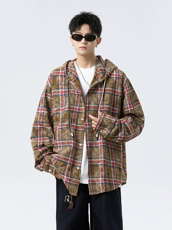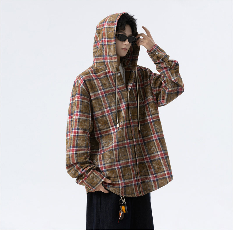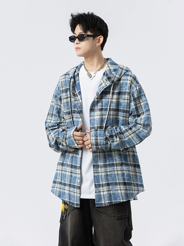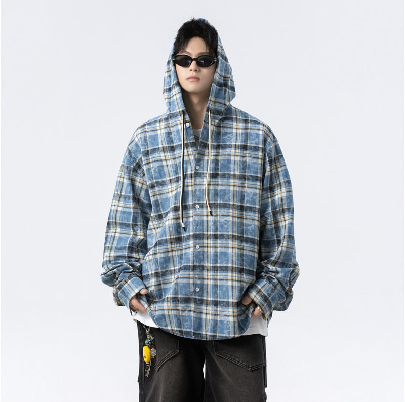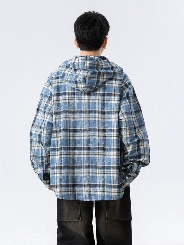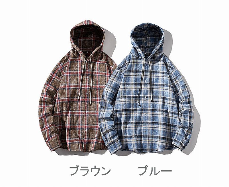 ブルー系のチェック柄がおしゃれなフード付き長袖シャツです。
