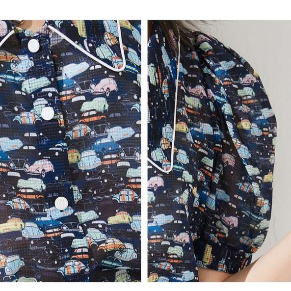 優美なパフスリーブと大きな襟が特徴的な柄シャツ。