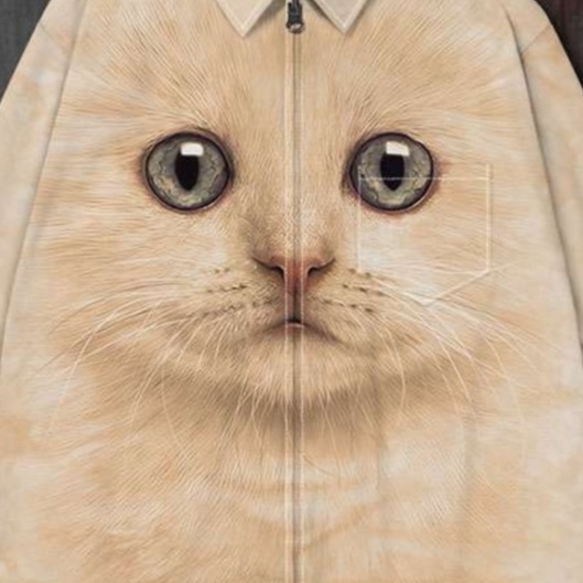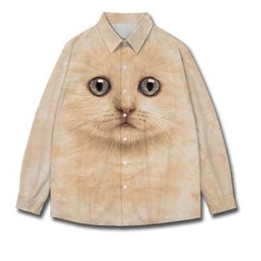 大きな瞳が印象的な猫の顔をモチーフにした柄シャツ。細部まで繊細に描かれた猫柄シャツは、胸元全体に美しい毛並みと表情が表現されています。