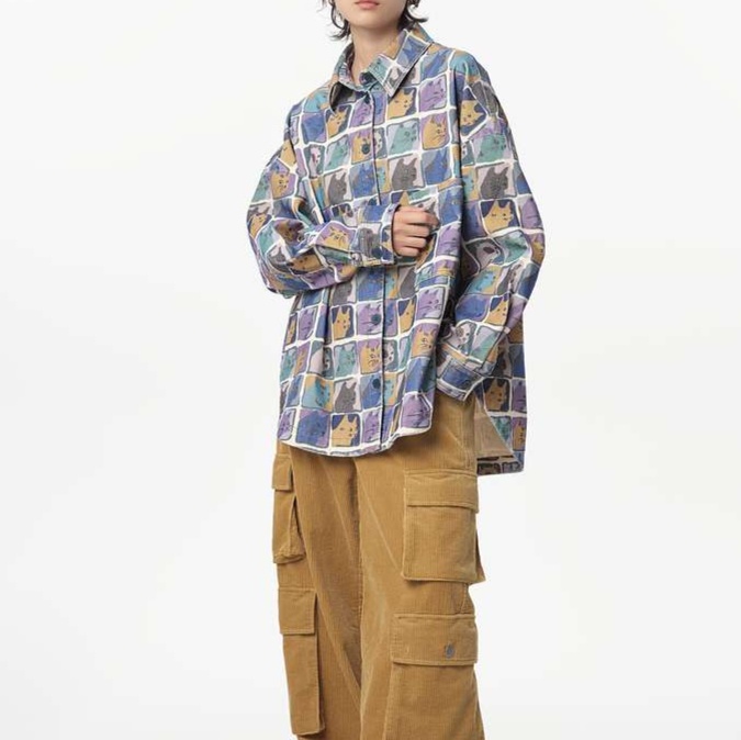 ポップなタッチで描かれた猫柄シャツは、カジュアルな着こなしのアクセントに最適。