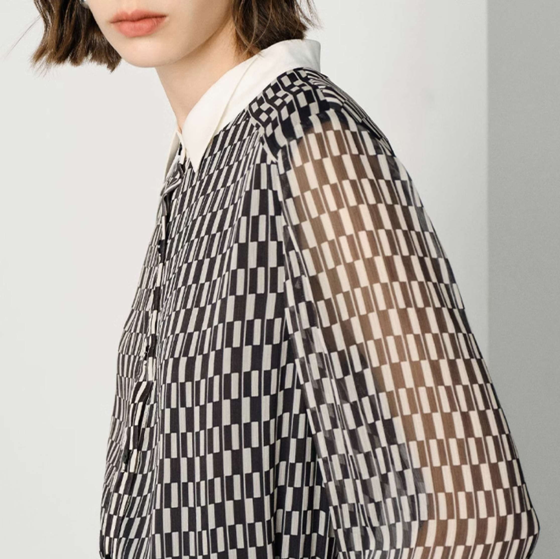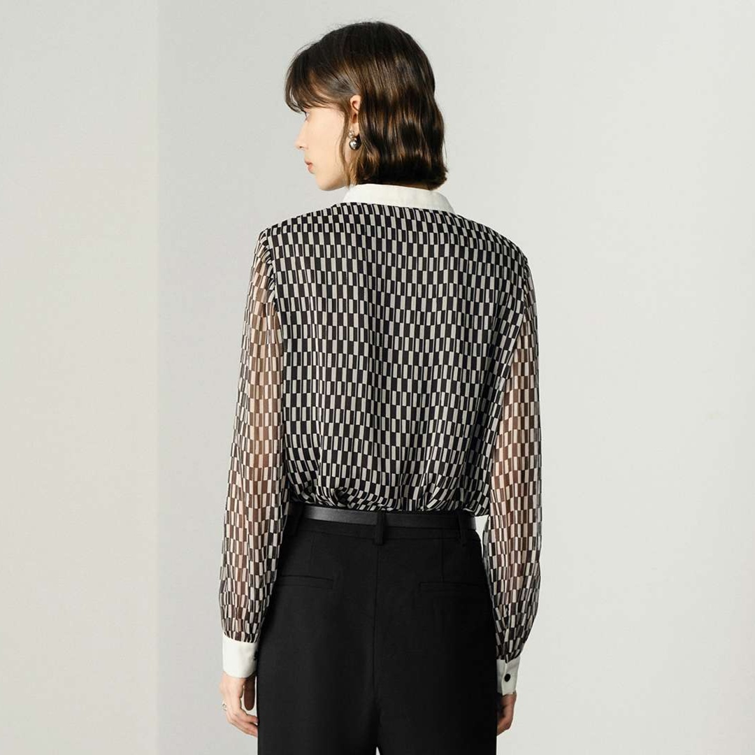 透け感のある生地に幾何学的な市松模様を施した総柄シャツ。白い襟とカフスがアクセントとなり、オフィスやお出かけシーンでも活躍する上品な一着。袖のボリューム感が女性らしさを引き立て、スタイリングの幅を広げる魅力的なアイテム。柄シャツの選び方に迷ったら、ぜひおすすめしたい一品です。