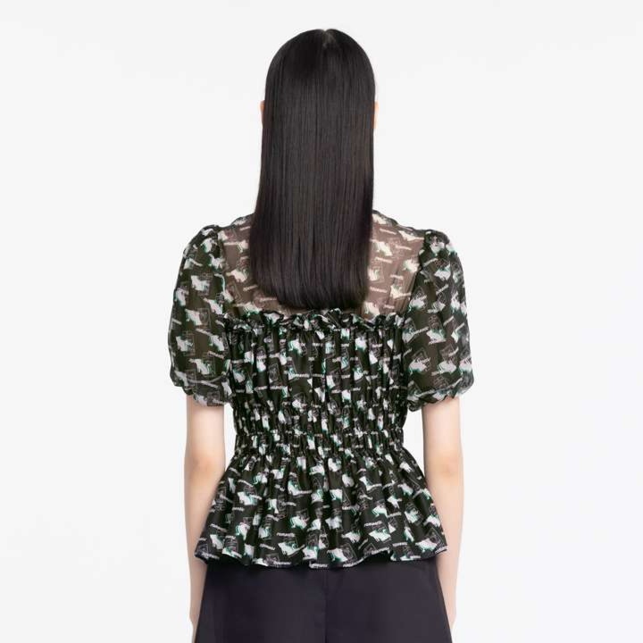 幾何学模様が目を引く総柄シャツ。スクエアネックとパフスリーブが特徴的で、スタイリッシュな印象を与える。ウエスト部分のギャザーが美しいシルエットを生み出し、透け感のある軽やかな素材で快適な着心地を提供。柄シャツとして、コーディネートのアクセントにもぴったり。