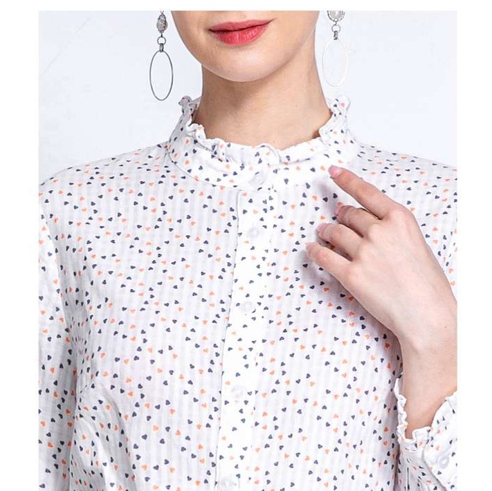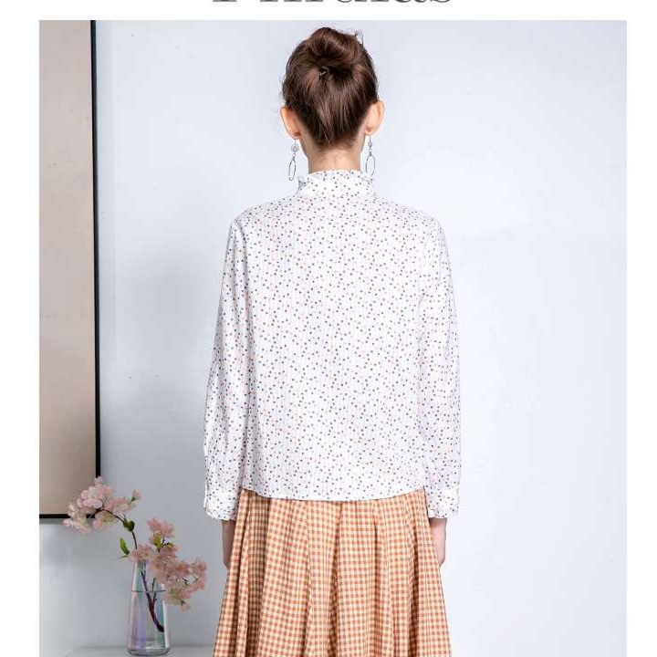 優雅な小花柄が印象的な白柄シャツ。スタンドカラーとふんわりした袖が、女性らしい魅力を引き立てるデザイン。胸元のギャザーや袖口のフリルが、さりげないアクセントとなり、カジュアルからフォーマルまで幅広く活躍。洗練されたスタイルを楽しむための一枚に仕上げました。