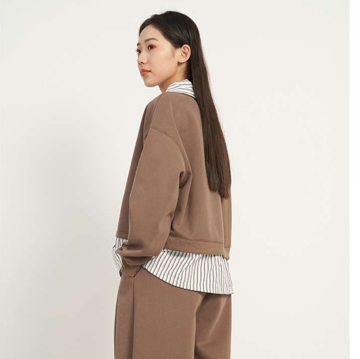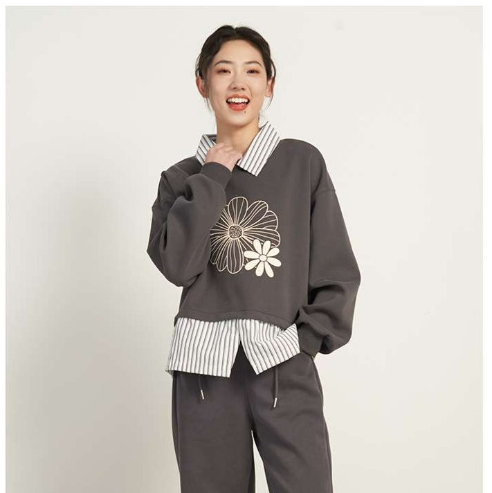 ストライプシャツとスウェットの重ね着風デザインで、こなれた印象を演出
